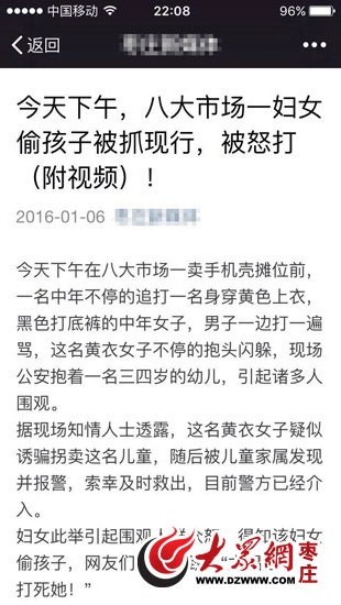 朋友圈微信瘋傳“八大一婦女偷孩子被怒打”,同一消息在全國多地傳播。