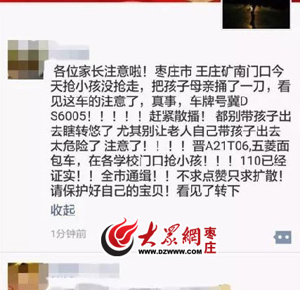 3月20日左右,棗莊市民的朋友圈里又出現(xiàn)一則驚人的消息:有人在棗莊王莊搶孩子,還有家長被捅傷。棗莊警方于3月21日進行辟謠,表示并沒有接到類似警情,該消息為謠言。