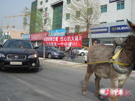 17日9時許,大慶市東風新村九區批發市場對面的大慶中冀汽車銷售有限公司(“斯巴魯”專賣店)門前異常熱鬧。一些老年人穿著鮮艷的服裝,踩著鼓點,扭著大秧歌。專賣店門口的大樹上掛著一條橫幅:失望的斯巴魯,傷心的大破車,還消費者一個公道!15時許,一頭毛驢拉著一輛“斯巴魯傲虎”汽車開始游街,街上圍滿了看熱鬧的人。 dh^ |6
