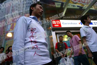 信報訊(實習(xí)生何明)昨日19時40分,羅先生仍在與家樂福方莊店的相關(guān)負(fù)責(zé)人商談解決方案。昨日下午,羅先生身穿寫有“家樂福坑人”的背心在超市門口引起了不少人注意。超市相關(guān)負(fù)責(zé)人表示,現(xiàn)在還無法確定這名顧客是從該店買走了這些啤酒的,但超市方面會與顧客協(xié)商解決此事。