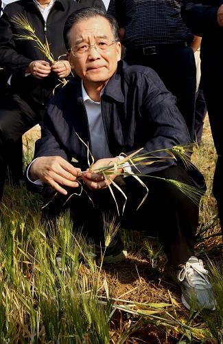 這是3月19日,溫家寶來到陸良縣芳華鎮獅子口村萬畝大麥示范田,實地察看農作物受災情況。 新華社記者 姚大偉 攝