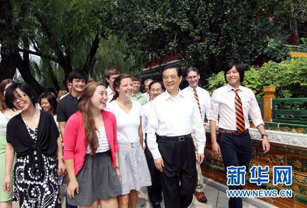 7月15日,國家主席胡錦濤在北京中南海會見美國佩頓中學訪華師生。這是胡錦濤主席在瀛臺林蔭路上同佩頓中學師生們親切交談。 新華社記者 蘭紅光攝