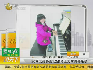 她叫唐燦輝,今年20歲,家住湖南省寧鄉縣楓木橋鄉山龍村,今年高考以優異成績考進了西南科技大學音樂表演專業。由于身高原因,學校老師和同學都稱她為“袖珍姑娘”。她說,“我的理想就是把專業知識學好,以后從事特殊教育或者進入藝術團!保ㄎ模核拇ㄐ侣劸W)