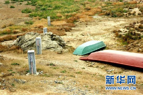 這是1月3日在江西都昌縣印山附近拍攝的裸露的鄱陽湖都昌水文站測水柱。 新華社發