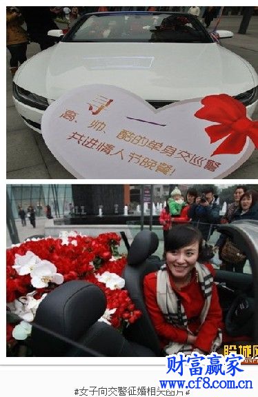 情人節這天浪漫的新鮮事兒真是不少,在重慶一名女子開跑車向交警征婚的照片在網絡一發布,立刻引發網友熱議,有網友質疑這名穿戴名牌開跑車高調現身的女子是否是借著向交警征婚一事而自我炒作,也有的網友表示在現在的年代,女子高調求愛并非什么稀罕事,而女子在情人節準備了千朵玫瑰在車后座向交警征婚也不足為奇。