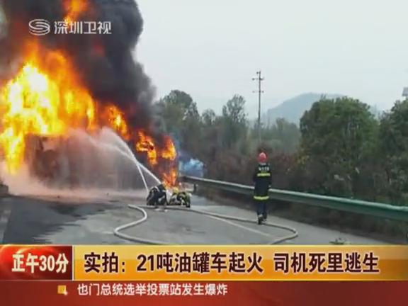 實拍21噸油罐車側翻起火 司機死里逃生