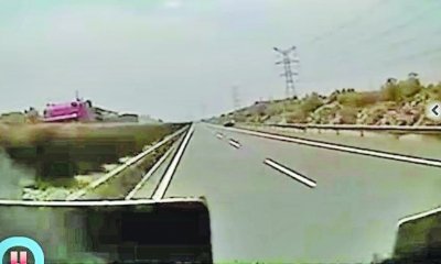 紅色貨車上飛出大塊金屬物。