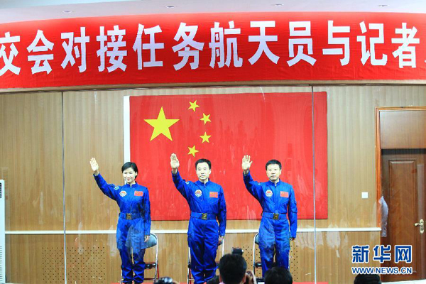 新華網快訊:神九航天員飛行乘組與中外記者見面會舉行。 景海鵬