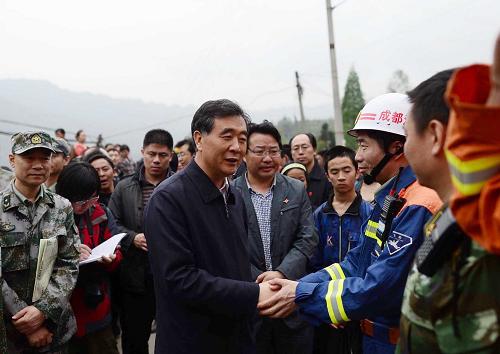 4月21日,中共中央政治局委員、國務院副總理汪洋在四川蘆山地震災區繼續指導抗震救災工作。 新華社記者 江宏景 攝
