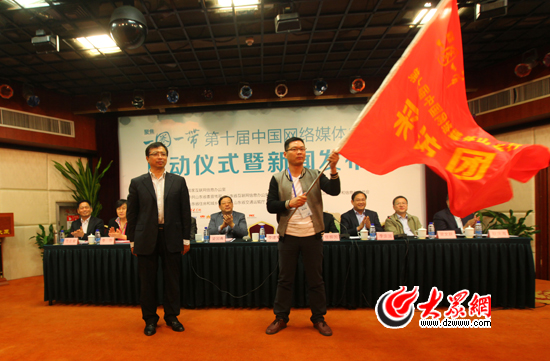 中共山東省委宣傳部副部長、山東省互聯網信息辦公室主任李建軍為采訪團授旗,新華網記者張巖接旗。