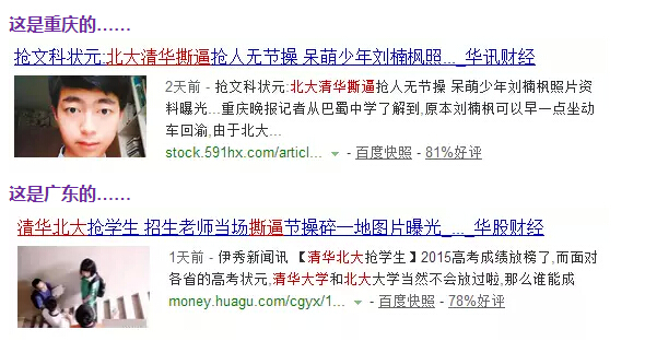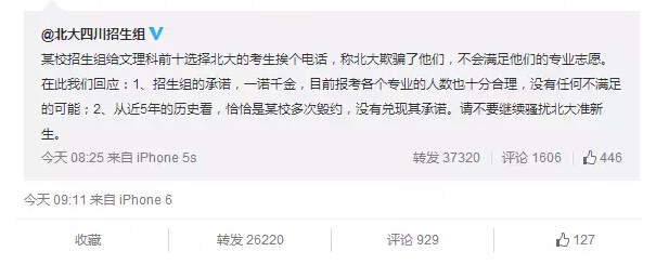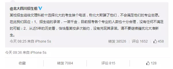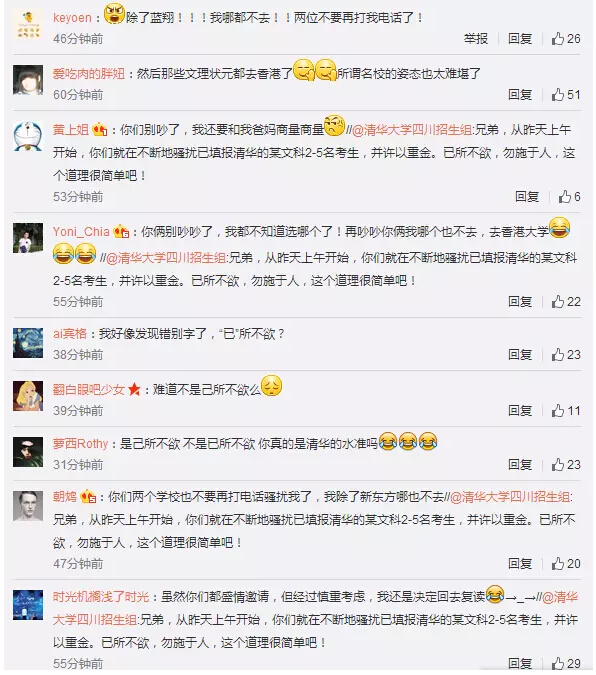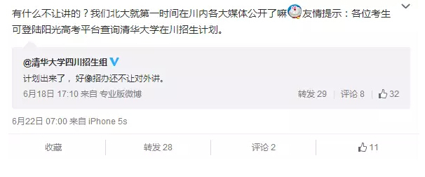 最精彩的當(dāng)屬清華、北大在四川省的招生組。今天上午8點(diǎn)25分,@北大四川招生組 在微博上發(fā)布消息,義憤填膺矛頭直指@清華大學(xué)四川招生組,