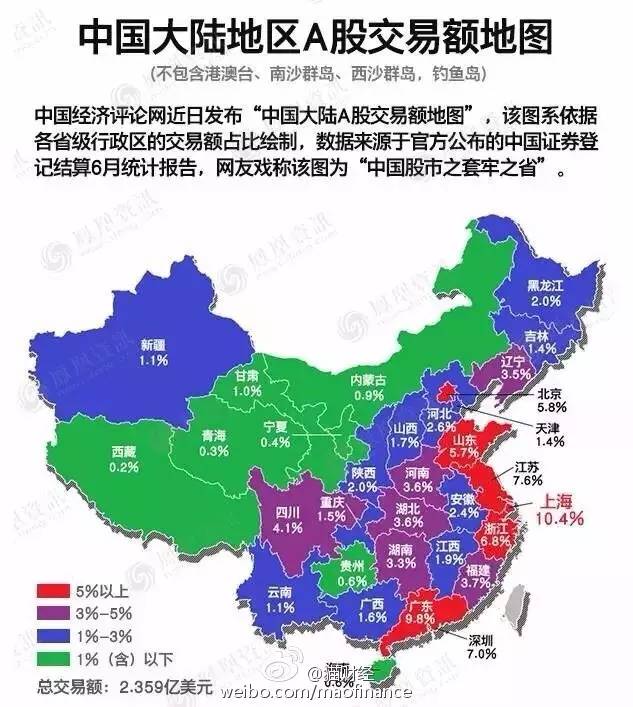 交易額排名前十的省級行政區(qū)(數(shù)據(jù)來源于中國證券登記結(jié)算6月統(tǒng)計報告): No.1 上海10.4 No.2 廣東9.8(深圳:7) No.3 江蘇7.6 No.4 浙江6.8 No.5 北京5.8 No.6 山東5.7 No.7 四川4.1 No.8 福建3.7 No.9 河南3.6 No.10 湖北3.6(與河南并列第九名)