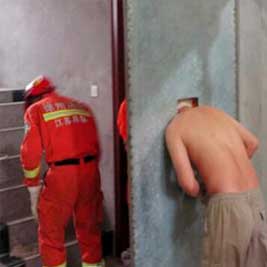 ▲囧!近日,江蘇43歲的張先生因嗜酒如命,被妻子關進了自家的小黑屋反省。激動的張先生把頭探出門鎖,不了卻被卡住,無法動彈(圖),后請求消防官兵救援才得以解脫。(東方網)