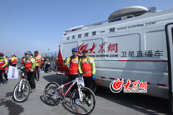 參加活動的騎友與大眾網衛星直播車合影。