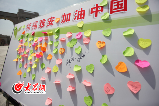 參加大眾網主辦的2013年春季自行車騎行活動的騎友們,在活動中寫下心愿卡共同為震區的同胞祈福。來自濟南的“80后”女孩漆文芳一口氣寫下了4張心愿卡,希望能夠祝愿震區的同胞平安。