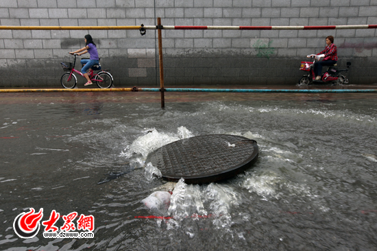 大眾網記者發現,在歷山路鐵路橋西側還有一處“噴泉”, 非機動車道上一個井蓋被地下水道的積水頂了起來,自行車和行人只能淌水經過。在井蓋附近約兩百米的路段上,一輛挖掘機正在進行施工。施工人員告訴記者,他們正在進行管道改造和安裝排水泵。“一下暴雨,水都流進下水道了,來不及流走就容易把井蓋頂起來。排水泵安好了,就能及時排走這些積水。”