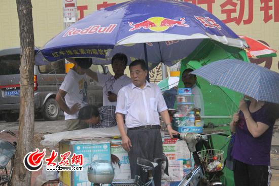 沒帶雨具的市民只好在報攤的遮陽傘下躲雨 (大眾網記者 赫洋 攝)