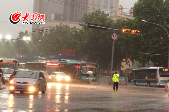 下午18點(diǎn)11分,在歷山路與和平路口,交警在大雨中指揮交通。見習(xí)記者 劉明明 攝
