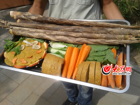 今天是中秋節,為了能讓動物們也能感受到傳統佳節的氣氛,動物園還為熊貓準備了特別制作的“月餅”。“這是叮叮和咚咚第一次在濟南過中秋,我們用熊貓平時最愛吃的精飼料制成月餅形狀,里面夾上它們最愛吃的蘋果和香蕉等水果,讓叮叮和咚咚也和我們一樣過中秋。”飼養員賀景昭介紹說,動物園不僅為熊貓們準備了“月餅”,還配上了胡蘿卜、竹筍、窩頭等食物。
