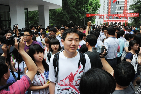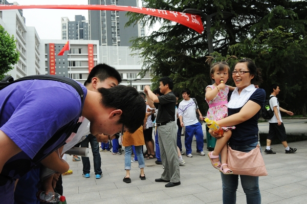 “出來了!出來了!”隨著考試結束鈴聲的響起,有不少考生開始往校門口走來。在外等候的人群中也響起陣陣掌聲,向剛剛走出“戰(zhàn)場”的考生們致敬。