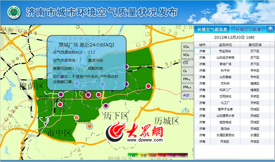大眾網(wǎng)濟南12月20日訊(記者 王磊 盛堃)今天,山東實時公布PM2.5首日,濟南15個監(jiān)測點中有8個監(jiān)測點顯示“重度污染”。濟南市環(huán)境保護監(jiān)測站大氣監(jiān)測科科長呂波說,當前使用的環(huán)境空氣質(zhì)量指數(shù)(即AQI)標準包括PM2.5等六項內(nèi)容,比過去更嚴格,更貼近戶外直觀感受,請市民理性看待。另外,當前發(fā)布的內(nèi)容中,還新增了出行建議,將來空氣質(zhì)量預報及預警也有望納入發(fā)布范圍。