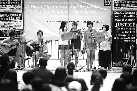 頗有意味的是,8月29日菲律賓遇難港人哀悼會舉行的同時,菲律賓海外工作者聯合會和菲律賓人香港聯合會也在中環支起一個攤位,號召在港菲人簽名聯署一封給菲總統的信件,要求“改善菲律賓人權與和平”。工作人員說,香港人質遇害,也是菲律賓人權與和平狀況差的一種表現,這是相關聯的。