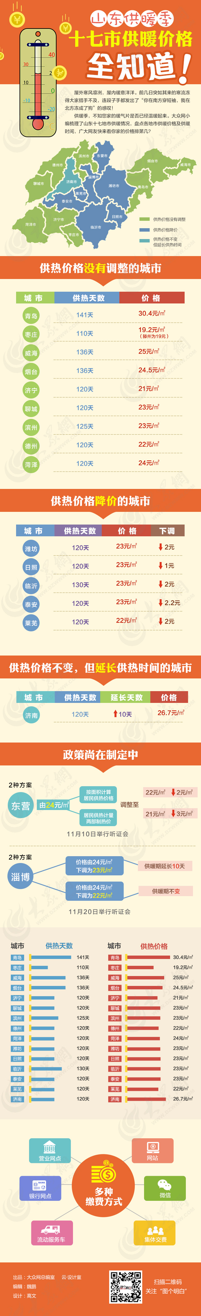 隨著煤炭?jī)r(jià)格的走低,我省五個(gè)城市的供暖價(jià)格也隨之下調(diào)。其中濰坊供暖價(jià)格由25.6元下調(diào)2元,供熱120天;日照供暖價(jià)格下調(diào)至23元/㎡,供熱天數(shù)120天。臨沂市供暖價(jià)格由25元下調(diào)2元,供熱天數(shù)130天不變。 泰安今年供暖120天,供熱價(jià)格由25.2元下調(diào)2.2元。萊蕪供熱暖價(jià)格下調(diào)2元至22元/㎡,供熱天數(shù)120天。