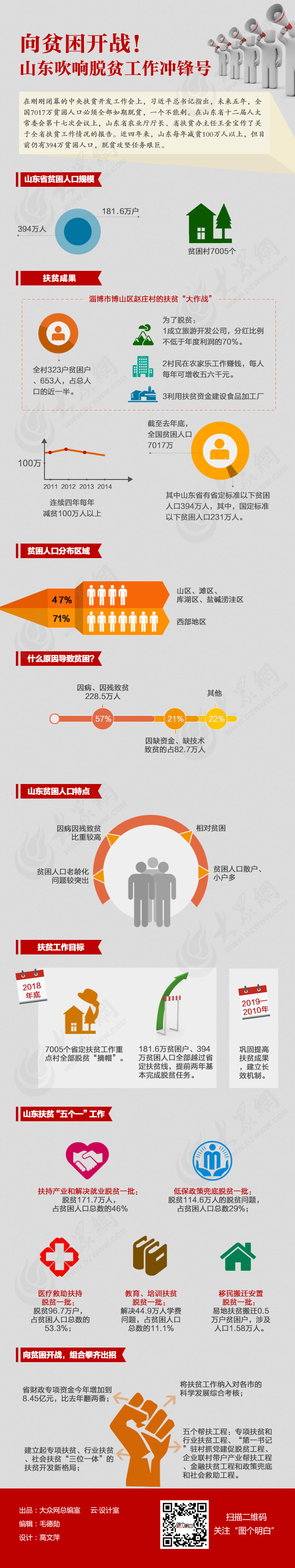 為完成2018年全省全部脫貧的目標,山東將推進“五個一批”工作向貧困“宣戰(zhàn)”,即通過扶持產業(yè)和解決就業(yè)脫貧一批;通過低保政策兜底脫貧一批;通過醫(yī)療救助扶持脫貧一批;通過教育、培訓扶貧脫貧一批;通過移民搬遷安置脫貧一批,主要解決符合國家有關規(guī)定、有意愿進行易地扶貧搬遷貧困戶的脫貧問題。