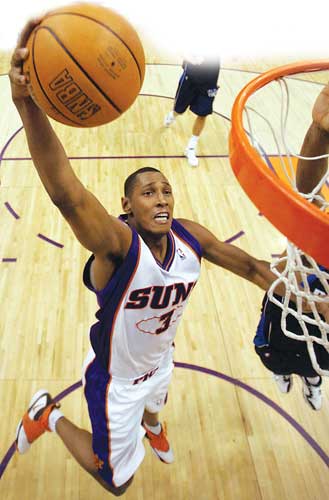 太陽第一節就先聲奪人,曾以12∶4領先。在這節結束時雙方打成28平。此后,太陽逐漸領先,分差也越拉越大,第三節結束以57∶43領先14分,第四節剛過4分10秒又擴大到89∶69。又打了兩個回合,小牛一看翻盤沒門,遂換下首發,承認失敗。