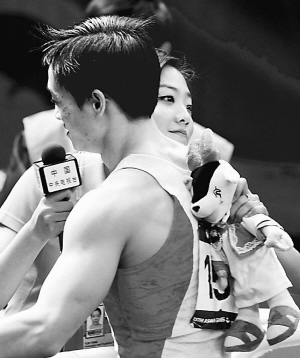 多哈體操場的看臺上,總有一個柔情似水的目光注視著場上的威威;而每當中國隊獲勝之后,總會有一個可愛的吉祥物拋向看臺上的云云。
