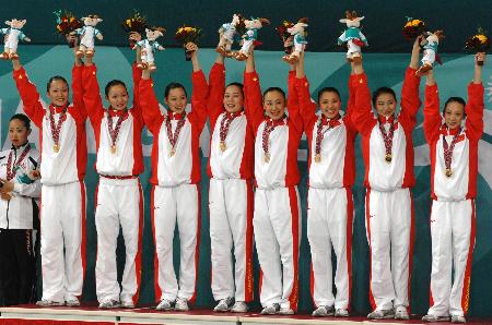 12月9日,中國隊選手在頒獎儀式上向觀眾揮手致意。當日,中國隊在多哈亞運會花樣游泳團體決賽中以96.584的總分獲得金牌。這也是中國代表團在本屆亞運會上奪得的第一百枚金牌。