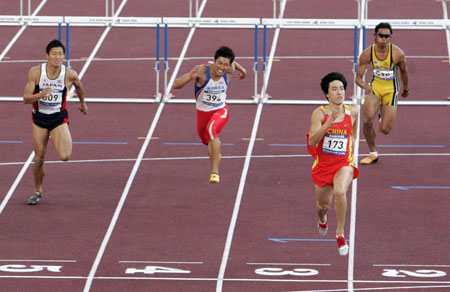 新浪體育訊 北京時間12月12日消息,在剛剛結束的亞運會男子110米欄決賽中,中國飛人劉翔以13秒15成功衛冕,這個成績還打破了劉翔自己保持的13秒27的亞運會紀錄。177號史冬鵬以13秒28的成績獲得亞軍。