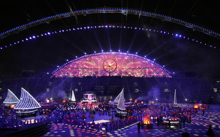 2006多哈亞運會閉幕式將于當地時間12月15日19時(北京時間12月16日零時)在哈里發體育場舉行。本屆亞運會開幕式精彩紛呈,而以“一千零一夜”為主題的閉幕式將更為吸引人,其中《東方神韻》“廣州10分鐘”將成為一大亮點。(中體在線 白宇攝) |