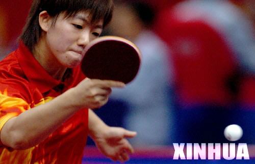 10月13日,北京隊選手張怡寧在比賽中。當日,在江蘇無錫進行的第十屆全運會乒乓球團體賽第一階段最后一輪的比賽中,張怡寧以3比1擊敗廣東隊選手劉詩雯。最終,北京女隊以3比1擊敗廣東隊。