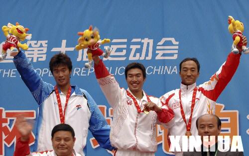 10月14日,河北選手溫海瑞(中)在十運會自行車男子場地4公里個人追逐賽決賽中,以4分47.417秒的成績獲得冠軍,遼寧選手曾昭宇(后左)獲得亞軍,河南選手馬亞軍(后右)獲得季軍。