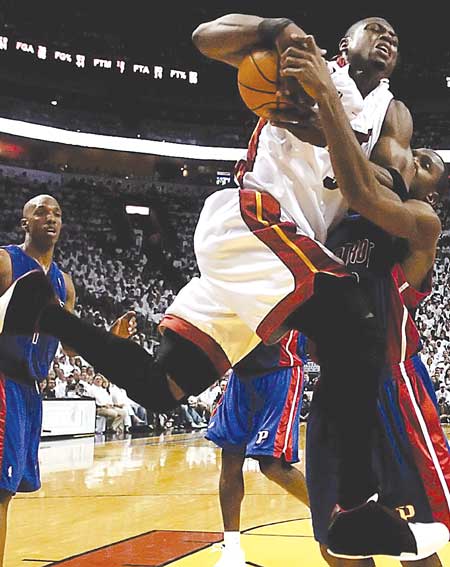 但關(guān)鍵的第四節(jié)韋德猛醒,他連投帶扣加罰球,一氣又添12分,最后以31分的全場(chǎng)之最,率領(lǐng)熱火隊(duì)以89∶78擊敗活塞隊(duì),現(xiàn)以3∶1的總比分在東部決賽中占優(yōu),再贏一場(chǎng)即可淘汰對(duì)手,挺進(jìn)總決賽。