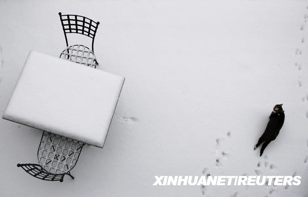 1月9日,在德國法蘭克福以南30公里處哈瑙的一個花園里,一只貓在雪中漫步。
