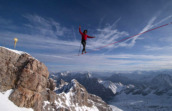 楚格峰是德國最高峰,海拔1746米。在山峰之間走鋼絲和在室內走鋼絲不同,繩索、鋼絲必須保持相對松弛,這樣扎克根據繩索的搖擺程度便可知道下一步應該怎么走。扎克僅僅依靠一根系在鋼絲上的繩索保障人身安全,他在鋼絲上來回走了3次,成功完成挑戰。