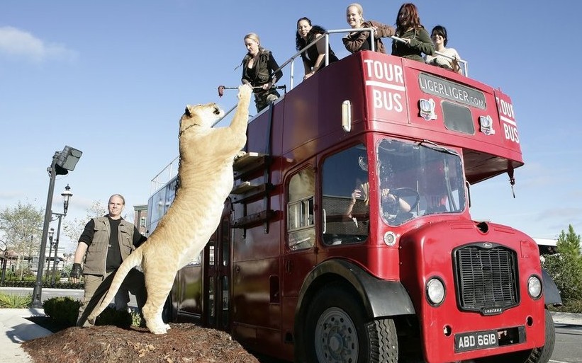 1月26日,美國南卡羅來納州美特爾灘,獅虎獸Hercules來到英倫風情濃郁的自由式音樂公園。這里有著倫敦式樣的出租車和電話亭。Hercules還趴在著名的倫敦紅色雙層巴士上飽餐了一頓。
