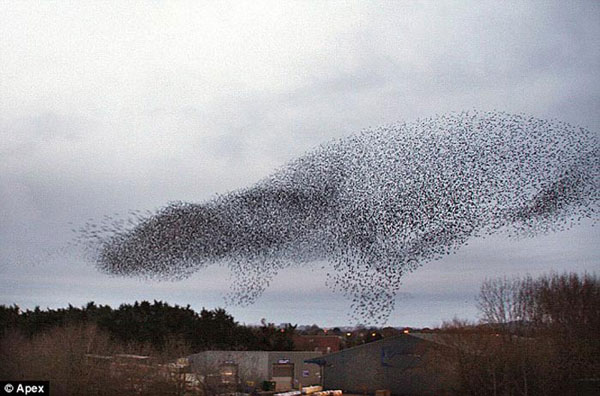 陶頓市上空的八哥流暢地組成一只巨型烏龜。這些八哥在飛行中擴展收縮并且改變形狀。每一只八哥都可以領頭,它們可以同時從不同方向、不同角度預防掠食者,也可以快速找到食物。據英國《每日郵報》2月1日報道,大量八哥日前聚集于英國薩默塞特郡陶頓市,它們一會兒組成了一只巨型大鳥,一會兒又組成了一只烏龜的形狀。