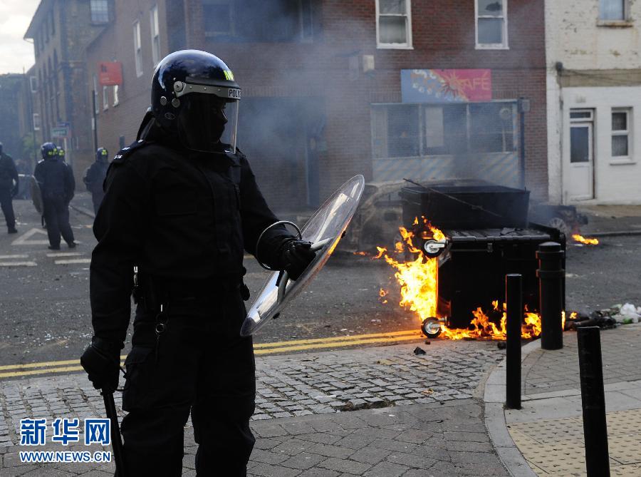 8月8日,在英國首都倫敦東部的哈克尼區(qū),警察向騷亂者推進。 8月6日晚開始于倫敦北部托特納姆的街頭騷亂8日呈現(xiàn)蔓延趨勢,倫敦多個社區(qū)出現(xiàn)打砸、縱火和搶劫行為。 新華社記者曾毅攝