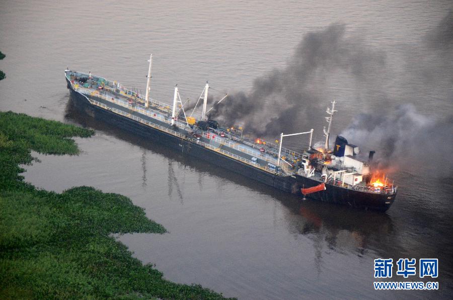 8月12日,一艘阿根廷油輪在巴拉圭比耶塔水域受到一艘巴拉圭拖船撞擊,造成油輪起火燃燒。 新華社/美洲通訊社