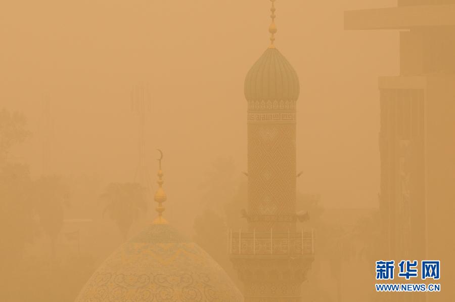 8月18日,伊拉克首都巴格達的一座清真寺矗立在沙塵中。伊拉克首都巴格達18日再度遭遇嚴重沙塵天氣,能見度極低。夏季的巴格達氣候炎熱干燥,較易出現沙塵天氣。新華社記者張寧攝