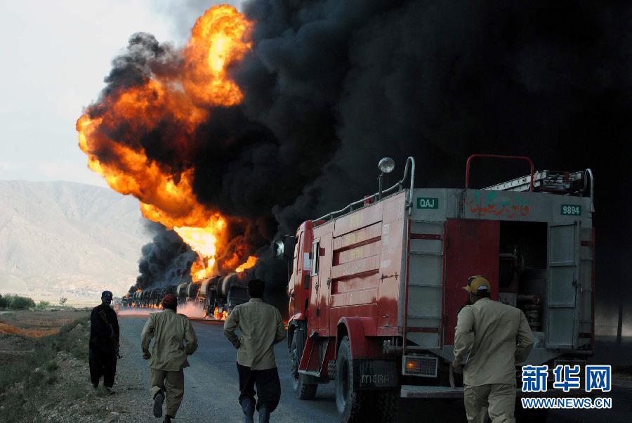 8月22日,在巴基斯坦奎達附近的默斯東地區,一輛消防車抵達被放火燒毀的北約油罐車處。當地媒體報道,當日,至少19輛北約油罐車在這一地區被人放火燒毀。 新華社發(哈桑攝)