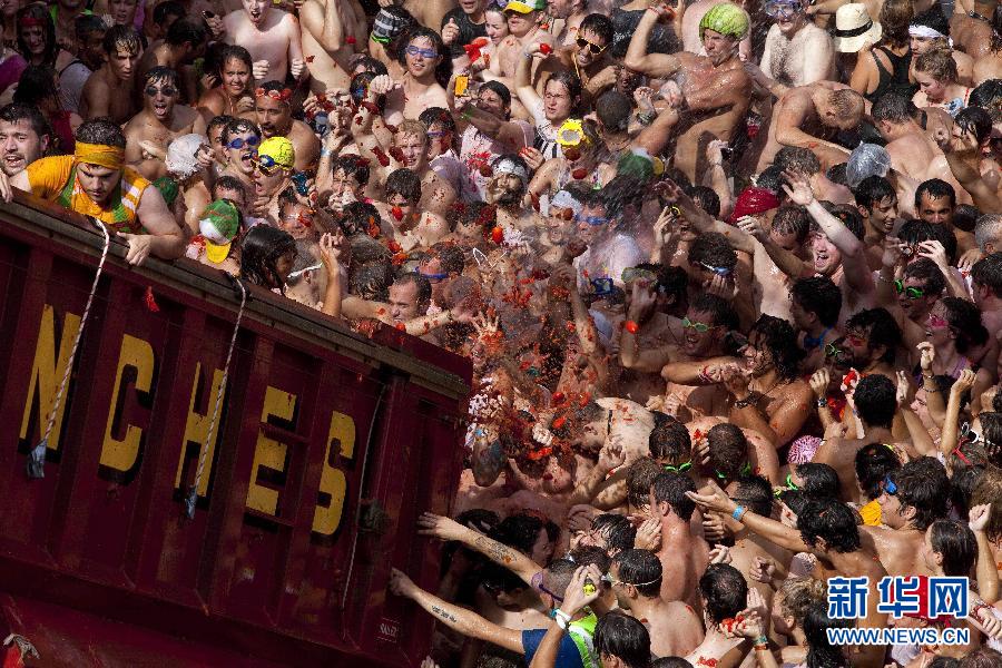 8月31日,在西班牙東部小鎮布尼奧爾,參加“番茄大戰”的人們互擲熟透的番茄。 “番茄大戰”源于1945年,于每年8月的最后一個星期三舉行,如今已成為西班牙的傳統節日。布尼奧爾小鎮的“番茄大戰”在全球的規模和影響力最大,現已經成為該鎮的招牌項目,給這個僅有1萬人口的小鎮帶來了許多游客。新華社/法新