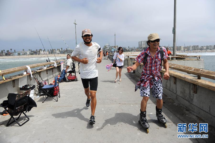 9月4日中午,王玄(左)抵達終點洛杉磯的威尼斯海灘。剛剛畢業于美國紐約州立大學的33歲中國留學生王玄6月8日從紐約出發,歷時89天,徒步3000多英里,行經13個州,成功橫穿美國大陸,于9月4日中午抵達美國西海岸的洛杉磯威尼斯海灘。新華社記者楊磊攝