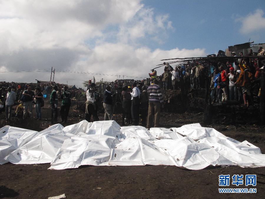 9月12日,在肯尼亞首都內羅畢工業園區附近,人們聚集在火災遇難者遺體附近。肯尼亞首都內羅畢警方12日證實,當天早些時候發生在首都工業園區附近的輸油管線火災已造成近百人喪生,另有多人受傷。內羅畢一處工業區的燃油庫地下輸油管線當天發生破裂,泄漏的原油流入附近一處貧民窟,當地民眾紛紛前往爭搶漏油。可能是因為有人在現場吸煙,引發了爆炸和大火。新華社記者宋晨攝