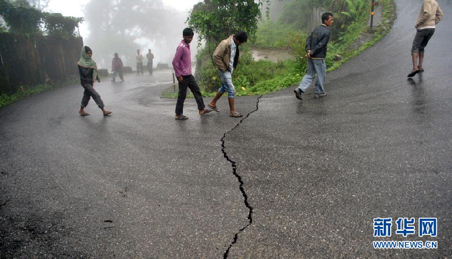 9月19日,在印度錫金邦首府甘托克,人們走過地震后裂開的路面。據印度當地媒體報道,18日發生在印度錫金邦的強烈地震已造成至少35人死亡。 新華社/法新