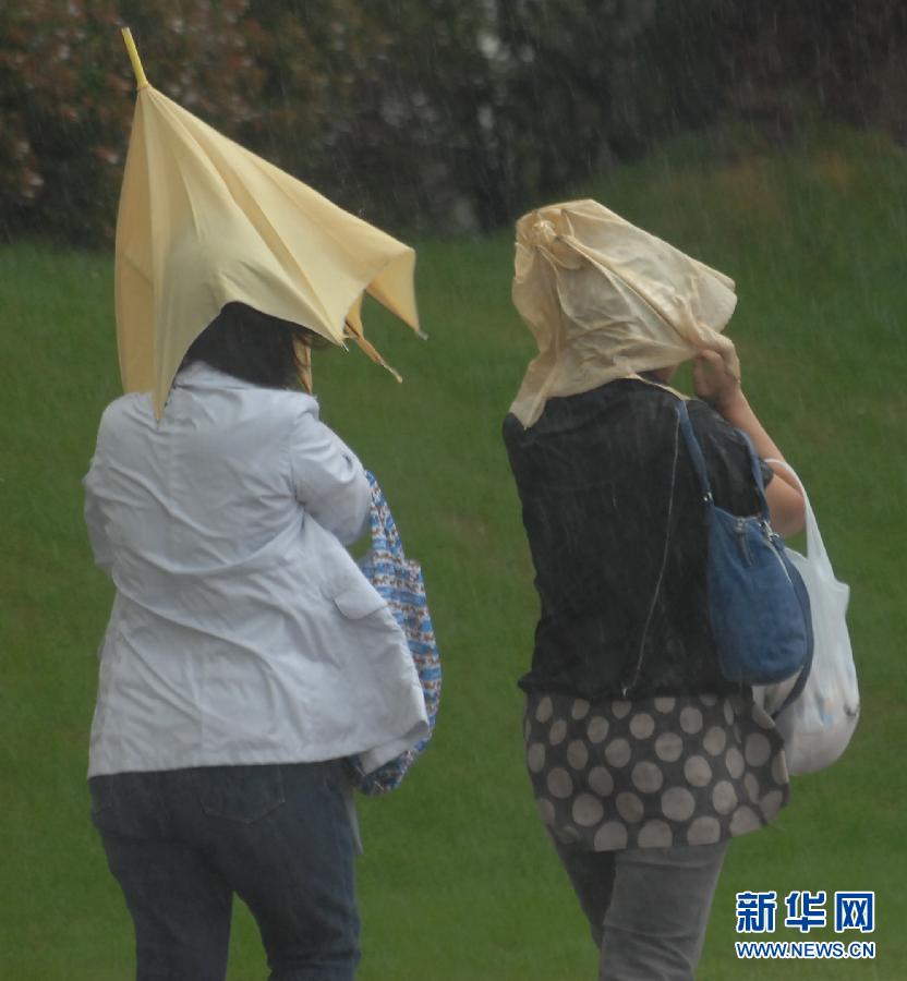 9月21日,在日本東京,行人在強風下步行。今年第15號強臺風“洛克”21日下午在日本靜岡縣濱松市附近登陸,日本西部、北部和東部各地出現強降雨天氣,迄今已造成6人死亡。截至當地時間11時,日本全國各地有大約7800人接到了避難指示,大約121萬人接到了避難勸告。 新華社發(關賢一郎攝)