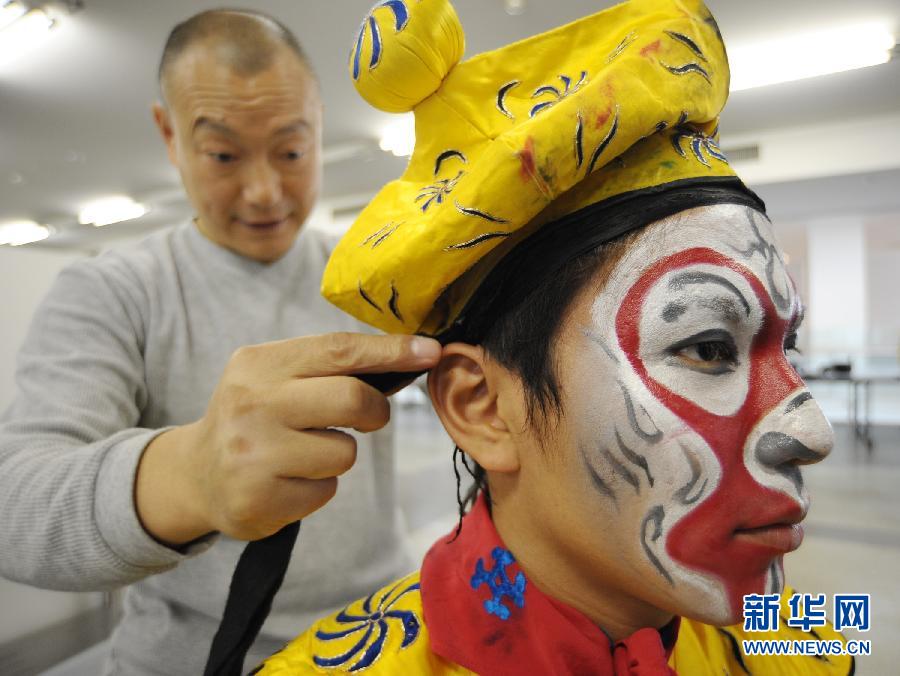 11月3日,在日本東京的明治大學(xué),表演京劇的學(xué)生(右)在上臺(tái)前化妝。當(dāng)日是日本的“文化日”,東京各地舉辦各種文化活動(dòng),很多文化遺產(chǎn)對(duì)市民免費(fèi)開放。著名學(xué)府明治大學(xué)每年11月都在位于杉并區(qū)的和泉校區(qū)舉辦校園文化節(jié),今年正巧碰上文化日,吸引了眾多參觀者。明治大學(xué)學(xué)生表演的京劇《盤絲洞》則獨(dú)樹一幟,成為文化節(jié)的一個(gè)亮點(diǎn)。新華社發(fā)(關(guān)賢一郎攝)